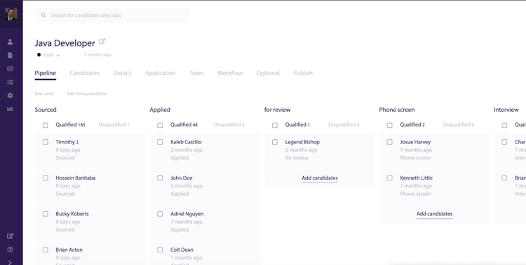 - Kanban view of the pipeline, complete with drag-and-drop functionality, so you can easily manage candidate progress