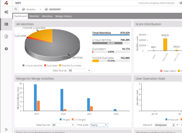 4medica delivers secure, integrated, and efficient access to unique patient data from multiple sources at the point-of-care with the highest level of open access security in the industry. Its unique 4-layer approach to MPI enables the seamless integration of disparate systems, simplifies implementation, and guarantees success of <1% patient duplication.