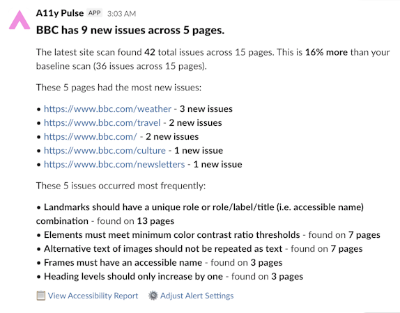 The software offers AXE based evaluation of web content accessibility guidelines at multiple compliance levels. Daily scans traverse pages across websites and classify issues as passing, failing, or requiring manual assessment. Detected concerns are prioritized by impact and severity and presented with visual markers, detailed descriptions, and implementation guidance. Reports are delivered to configured communication channels, including email and messaging platforms, and include page level user experience metrics.