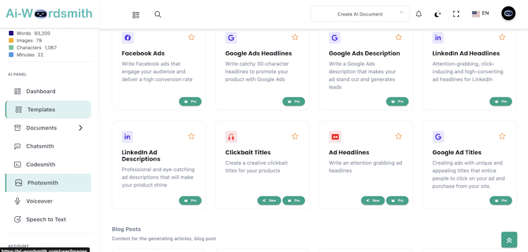 Ai-Wordsmith is an AI-powered writing platform that enables users to craft a diverse range of content at high speed. An array of tools provided by Ai-Wordsmith streamline the creation, editing, and publication of SEO-optimized articles, blog posts, advertisements, landing pages, eCommerce product descriptions, social media posts, and various other content forms.