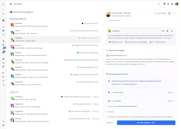 The Duo Copilot delivers daily signals, in-depth research, and multichannel outreach, while the Duo Copywriter creates hyper-personalized first touches. The Duo Inbox sends the perfect replies to prospects, and the Duo Voice feature enables scalable creative outreach. The platform leverages intent signals, job change alerts, and competitive intelligence to identify prime leads. It provides access to a comprehensive B2B database, enables social prospecting, and enriches lead data to build a reliable database. The multichannel engagement features, such as automated sequences and social automation, also help sales teams scale their outreach efforts.