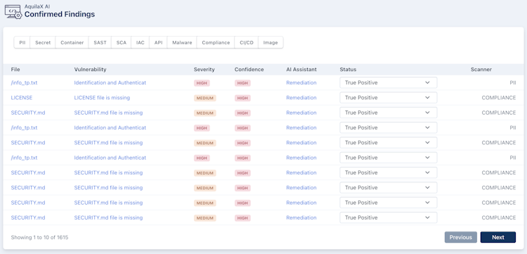 AquilaX supports a wide range of integrations, including GitHub, GitLab, CI/CD tools, and more. It also provides comprehensive compliance features, secret identification, PII scanning, static application security testing (SAST), open-source scanning, container scanning, infrastructure as code (IaC) scanning, API static scanning, and malware detection.