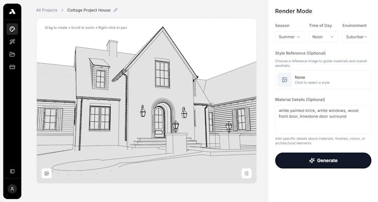 The platform accepts elevation drawings that can be enhanced by describing materials through natural language prompts which the AI interprets to generate photorealistic renders. Direct import of OBJ, FBX, and GLB file formats enables seamless integration with leading architectural software applications. Users can manipulate camera parameters including viewing angles, field of view, and aspect ratio before rendering. Environmental controls allow adjustment of seasonal conditions across spring, summer, fall, and winter settings and time of day parameters to modify lighting, shadows, and atmospheric effects. The system offers a mood board function whereby inspiration images inform the AI on colors, finishes, and stylistic elements that are applied to final renders.