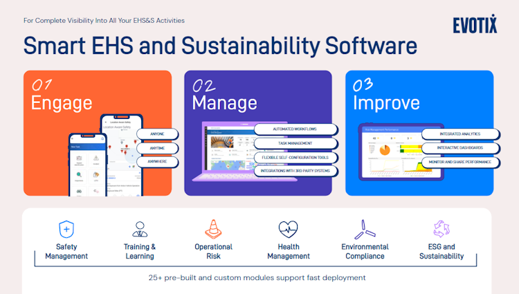 Evotix is an enterprise-grade EHS&S platform that unifies health, safety, compliance, ESG, environmental and training management in a single system using a shared data model. Recognized as a Leader in the Verdantix Green Quadrant, Evotix provides more than 800 organizations with a proactive, scalable and configurable solution to all their EHS&S needs.