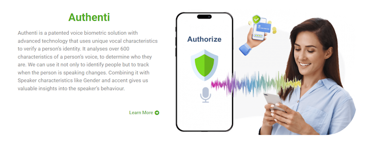 Authenti is a SaaS service that uses voice as a way of recognizing and confirming who someone is. Voice biometrics is a type of biometrics, which is a method of identifying people based on their physical or behavioral traits. Voice biometrics works by measuring and comparing the features of a person's voice, such as pitch, tone, accent, and pronunciation. These features are unique to each individual and can be used as a form of authentication, which is a process of verifying someone's identity.