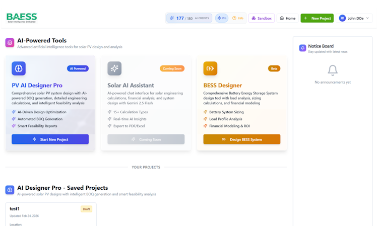BAESS Labs is an artificial intelligence powered design platform for solar photovoltaic systems that automates the creation of bills of quantities, battery energy storage system layouts and detailed financial analysis for commercial and utility scale installations. The software delivers a comprehensive workflow for engineering and project management teams at energy service providers, consulting firms and construction contractors. The platform applies artificial intelligence engines to reduce project development timelines by transforming multi hour design cycles into processes that complete within minutes. The platform operates on an integrated credit system that allocates consumption rates for different design activities.