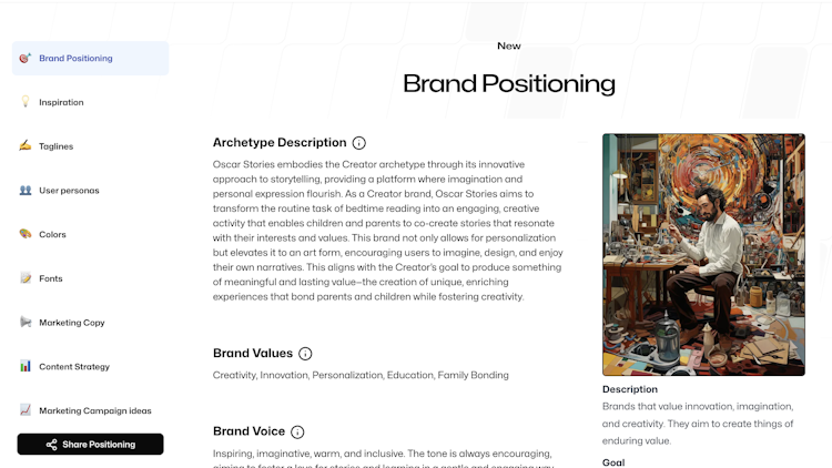 Branding5 is a brand positioning tool that helps businesses define their identity to solve marketing problems. Users start by inputting their basic brand details such as name, description, and unique selling proposition. Users can then select four archetypes from twelve classic options that best reflect their brand's personality and ideals.