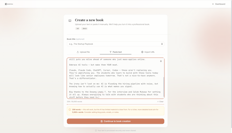 The platform’s core function centers on its Voice DNA feature which analyzes emails, articles, existing drafts and other written materials to develop a personalized voice profile. Raw inputs such as notes, deal memos, journals or unstructured ideas are structured into coherent chapters and sections. A full featured editor ensures professional interior formatting with automatic adjustment of margins, typography, spacing, page numbering and bleed settings suitable for print on demand services. Customizable book size and layout options adapt formatting to meet professional printing requirements.