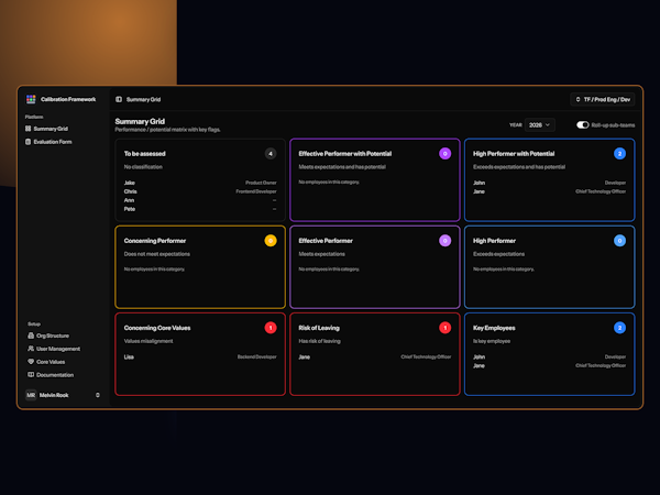 The platform centers on a three by three calibration grid that enables classification of employees across multiple dimensions simultaneously. Performance evaluation captures whether individuals meet expectations, exceed them, or require additional support, accompanied by detailed narrative commentary. Potential assessment identifies employees demonstrating readiness to expand responsibilities in a one year timeframe. Core values alignment functionality allows documentation of behavioral observations and specific examples reflecting adherence to organizational values. Retention risk flagging identifies employees showing signals of potential departure and designates key individuals who hold specialist knowledge crucial to operations. The system maintains a multi year perspective, allowing users to switch between current and historical calibration data to track progression over time. An auto-classification feature processes input data to position employees within the matrix automatically, providing an at a glance overview of talent distribution.