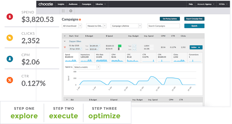 Choozle is a cloud-based digital advertising software that provides publishers and marketing agencies with tools to build targeted campaigns and analyze the performance of advertisements on a centralized platform. Supervisors can use the dashboard to gain an overview of total spend, ad clicks, CPM, and CTR via actionable analytics.