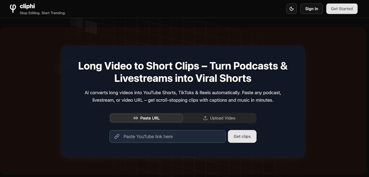 Cliphi is an AI powered platform that automates the conversion of long video content into short vertical clips optimized for social media platforms. The software processes podcasts, livestreams, tutorials, reviews, and other extended video formats and transforms them into ready to publish content for YouTube Shorts, TikTok, and Instagram Reels. The platform targets content creators, social media managers, podcasters, livestreamers, and digital marketers who require efficient content repurposing across multiple channels. It operates through a URL based workflow in which links from YouTube can be pasted or video files can be uploaded directly.