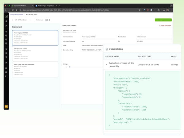 Connektica provides an open framework to connect and control test instruments, sensors, cameras, robots, and other equipment via APIs or custom scripts. Data from all sources is collected in real time and stored in a centralized and standardized format, enabling full traceability across parts, serial numbers, processes, and test results.
