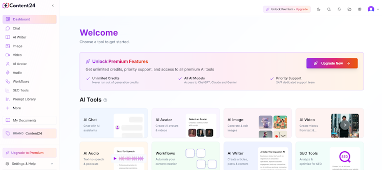 Content24.ai is an all-in-one AI content creation and business productivity platform built for companies that want to create, manage, and scale digital content faster from one centralized workspace. The platform brings together AI writing, AI chat, AI image generation, AI video creation, AI avatars, AI audio tools, AI workflows, AI SEO tools, and a prompt library, while also offering practical business utilities such as logo creation, file conversion, invoice generation, and QR code creation.