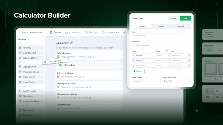 — Drag-and-drop builder with customizable fields and real-time calculation logic