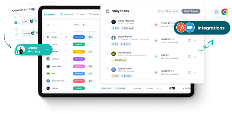 Crono is a AI-driven sales engagement platform that acts as a catalyst for a sales revolution. Crono connects to multiple CRM applications such as HubSpot, Pipedrive, and Salesforce. And it uses data and artificial intelligence (AI) to identify the best prospects to target and the right channels to use to maximize your conversion rate and help you book more meetings in less time.