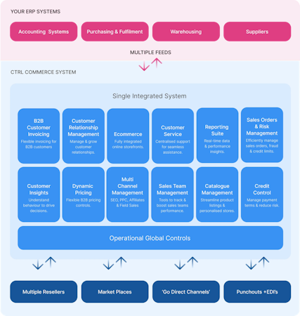 The platform offers a comprehensive suite of features organized into interconnected modules that address the multifaceted needs of B2B commerce. Core functionalities include PIM (Product Information Management), dynamic pricing capabilities, comprehensive eCommerce tools, customer service management, and an extensive reporting suite. The system incorporates sales team management tools, orders and risk assessment, customer insights analytics, and CRM functionality. Additional features include credit control mechanisms, a single customer view dashboard, catalog management tools, and B2B customer invoicing capabilities. CTRL Commerce enables businesses to automate complex pricing and promotions, personalize marketing with real-time analytics, streamline operations by eliminating system silos and syncing delays, and deliver seamless personalized digital experiences through self-service tools and an intuitive user interface designed specifically for B2B commerce complexity.