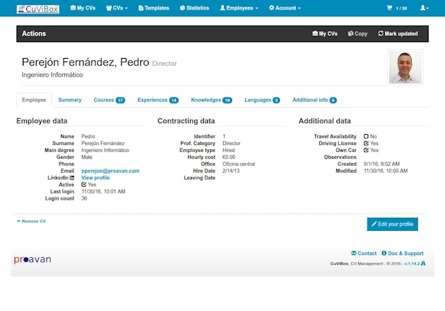 Other features: custom fields, internal clients and projects database, automated CV update management, batch update for employees and CVs, reporting...