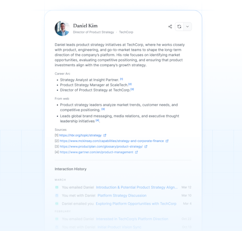 The platform’s core functionality centers on automated data aggregation from business and communication channels. Dana pulls LinkedIn profile information including professional role history and career progression of meeting participants so that users gain background and tenure details. The system retrieves company-level intelligence such as recent news articles, press releases, and funding announcements to deliver current organizational context. Email and calendar integration surfaces correspondence history and scheduling data that inform meeting purpose or relationship status. Connections to customer relationship management systems extract notes, deal stages, and historical interaction data logged by sales professionals. Slack conversation integration captures informal context from internal communications. The software extends its intelligence layer to web sources by conducting searches for publicly available attendee and organizational information. It also maintains user goals, territories, and responsibilities to personalize briefing content with relevant objectives and talking points.