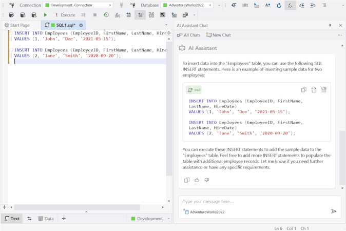 dbForge AI Assistant is an SQL AI generator that turns natural language into queries. The tool assists with code optimization and troubleshooting. It also simplifies database management and SQL coding through conversational experience. The tool lets users convert English into executable SQL queries, assisting users with code optimization, errors detection and fixes within a conversational interface of an SQL AI bot.