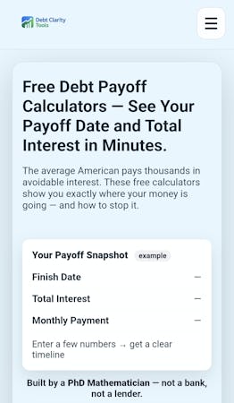 Debt Clarity Tools is a web-based calculation environment that provides debt payoff and loan analysis capabilities for consumer debt management. It delivers computational models for revolving credit balances, student loans, personal loans, and consolidated debt scenarios. The platform is intended for individuals carrying credit balances or installment loans who require quantitative analysis to inform repayment decisions. All operations execute without financial advisory services or institutional intermediation.