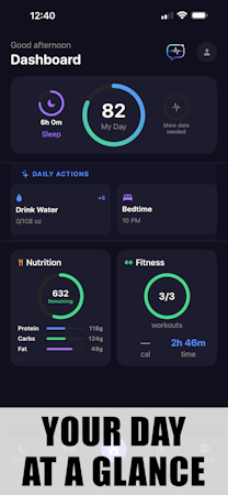 Nutrition tracking calculates personalized macronutrient targets using clinically validated energy expenditure formulas that account for body composition, activity level, and workout frequency. The system supports text-based database searches, barcode scanning, and AI-powered label recognition for logging items from a repository of eight hundred thousand branded and generic foods. Users can review macronutrient breakdowns for breakfast, lunch, dinner, and snacks while logging water intake through quick-add controls. The sleep tracking module monitors duration, stage distribution across deep, REM, light, and awake segments, heart rate variability, resting heart rate, and respiratory rate with data sourced from Apple Health. The sleep scoring algorithm evaluates these variables against clinical benchmarks for physical recovery and cognitive restoration and renders a sleep score along with a visual stage distribution chart.