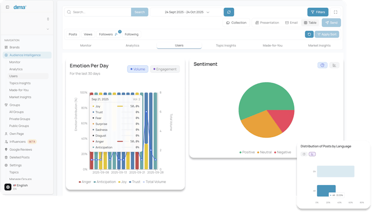 Dima is an advanced media monitoring and analytics platform that operates as an AI powered copilot with Arabic first intelligence capabilities. The platform serves agencies and enterprises across the Gulf Cooperation Council and Middle East and North Africa regions to track brand mentions across multiple media channels. More than two hundred fifty organizations trust the software to address the complexities of Arabic language monitoring by delivering accuracy across dialects, slang expressions and Franco Arabic text. The platform enables comprehensive visibility into brand presence, audience sentiment and digital conversation trends across both traditional and social media outlets.