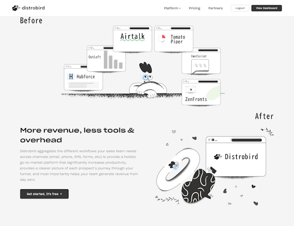 Distrobird significantly increases the productivity of your sales team, provides a clearer picture of each prospect’s journey through your funnel, and, most importantly, helps your team generate revenue from day zero.