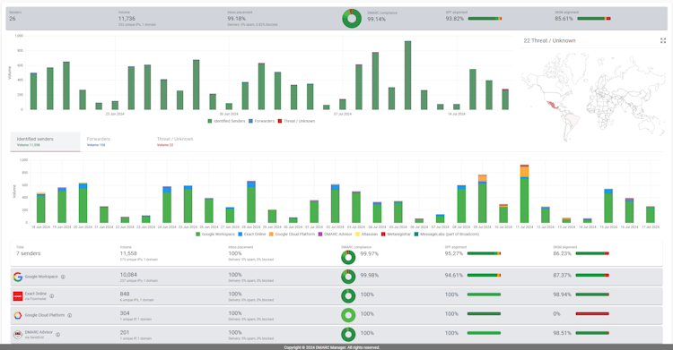DMARC Advisor’s DMARC Management Platform provides a web-based overview of all domains, including the status of DMARC, DKIM, SPF, NS, and MX per domain. Our enriched DMARC reports give an insightful overview of different aspects of your domains.