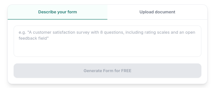 Users can describe forms in plain English as an alternative to uploading documents, allowing the AI to generate forms from text descriptions without requiring source files. The platform offers two deployment models. The first is a hosted web application accessible through any modern browser. The second is an open source Google Apps Script implementation available on GitHub for self-hosted use. Document processing follows a privacy-focused architecture in which uploaded files are analyzed for structure extraction and discarded once processing is complete, with only form titles and links retained.