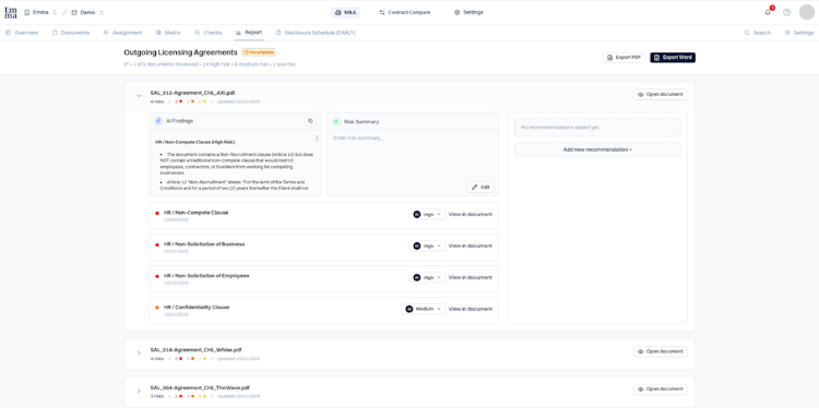 Analytical results are organized by legal specialty and jurisdiction to support task assignment, resolution tracking, and audit trail requirements. Granular access controls enable role-based permissions while collaboration features include change tracking and approval management that keep deal teams aligned on progress. The platform generates due diligence reports that can be edited, shared, or downloaded and provides dashboard visualizations for real-time monitoring of review activities.