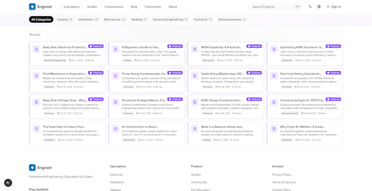 Enginist is a web-based engineering calculation platform that delivers standards-compliant calculators and technical guides for professional engineering disciplines. The platform addresses electrical engineering, heating, ventilation and air conditioning systems, plumbing design, fire protection, mechanical engineering and general utilities. The system operates on a freemium model that preserves core calculation functionality without payment and unlocks calculation history, project organization and professional documentation exports through optional user accounts.