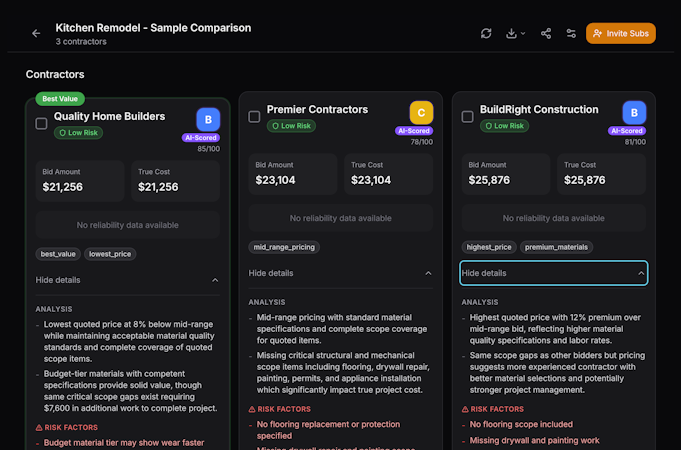 The platform uses artificial intelligence to extract data from documents submitted as PDFs, Excel files or CSV formats. Each line item is standardized to enable true side-by-side comparison of project scope and total cost. An anomaly detection system flags pricing outliers by benchmarking extracted items against local construction market data. A scope gap analysis feature identifies missing elements, exclusions or incomplete specifications and estimates potential change order risk for incomplete bids.