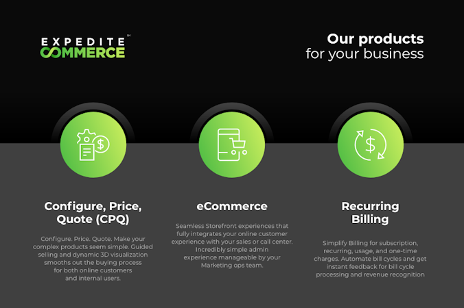 Expedite Commerce is a cloud-based platform built for Revenue Operations and Revenue Management in sophisticated B2B companies. The platform encompasses dedicated software for Configure-Price-Quote (CPQ), eCommerce storefront, Digital Sales Room, Contract Lifecycle Management (CLM), Recurring Billing, Revenue Recognition, Revenue Forecast, and Subscription Management. The company caters to the business needs of leaders in Sales Operations, Marketing Operations, and Subscription Finance and Revenue. With a comprehensive range of tools, real-time analytics, actionable insights, and unified dashboards the platform and its solutions serve industries such as Manufacturing, SaaS, Anything-as-a-Service (XaaS), IoT, Communications, and B2B Subscriptions.