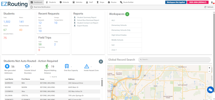 EZRouting is a comprehensive, cloud-based school transportation routing platform built to simplify every aspect of student transportation management. From initial route creation to day-to-day operations, EZRouting gives districts the tools they need to plan smarter, operate more efficiently, and keep every student safe.