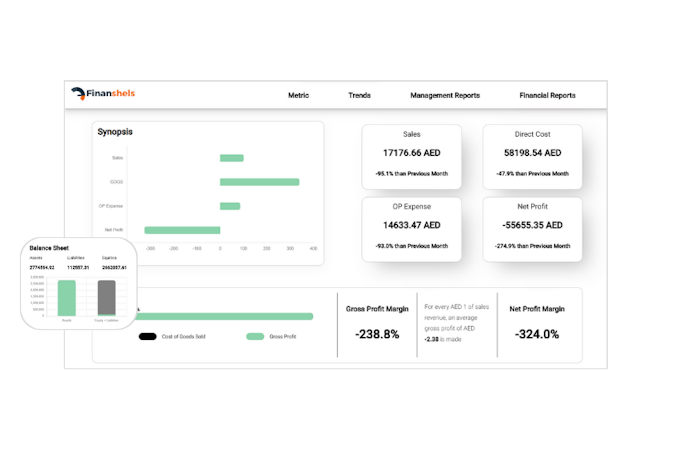 Finanshels provides advanced financial management dashboard that seamlessly integrates with your existing accounting software to provide real-time insights into your business's financial health. With an easy-to-use interface accessible across devices, Finanshels simplifies tracking, analyzing, and decision-making when it comes to your finances.