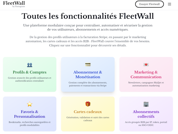 FleetWall is a unified subscription and user management platform that centralizes, automates and monetizes user communities across digital environments. The platform offers an integrated interface for SaaS subscription management, billing operations, access control and real-time analytics. The solution caters to content publishers, educational institutions, universities, training organizations and enterprises overseeing connected user networks in portals, applications and partner websites. By standardizing data flows and user journeys, the software enhances operational consistency and efficiency while maximizing audience engagement through centralized oversight of user accounts, subscription entitlements and access permissions.
