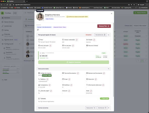 FlowPass is an academy management software suite that centralizes administrative operations for educational academies, training centers and sports facilities. The platform provides a unified interface for student enrollment, payment processing, attendance tracking and automated communications. Designed to support institutions of varying sizes in Latin America, FlowPass accommodates startups to established academies through scalable subscription options. The solution is offered as a cloud based service accessible via web browsers without requiring local installation.
