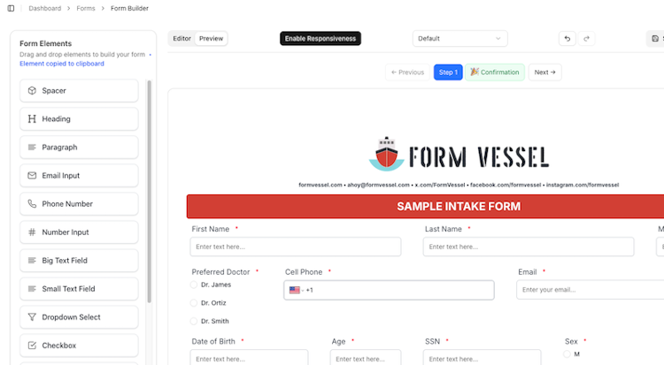 Form Vessel is a HIPAA compliant web form builder tailored for healthcare organizations to create and manage secure online patient intake forms. The platform enables medical practices, clinics and other healthcare providers to digitize paper based form processes while maintaining compliance with Health Insurance Portability and Accountability Act requirements. This solution targets entities seeking to enhance patient intake workflows and reduce administrative burden through streamlined data collection and technical safeguards aligned with federal guidance.