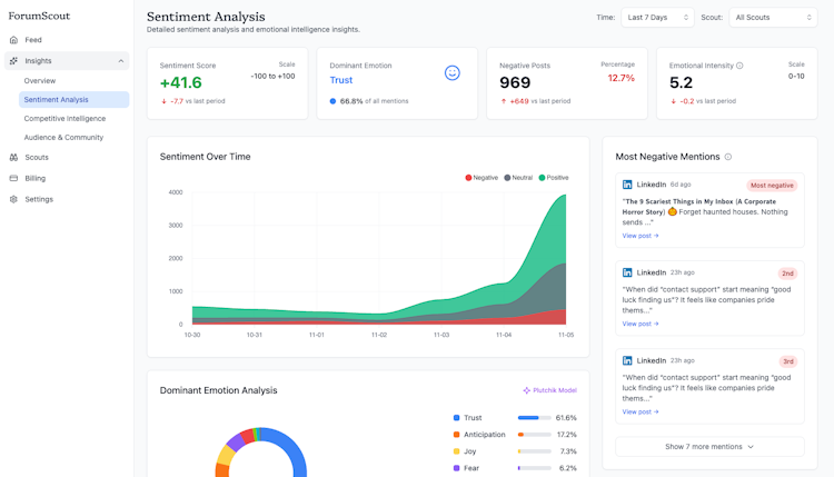 The platform offers a tiered feature structure with capabilities that scale according to user requirements. At its core, ForumScout provides keyword tracking across multiple platforms including Reddit, Twitter (X), LinkedIn, YouTube, Instagram, Bluesky, Hacker News, Facebook, forums, and news sites. Users can monitor up to one hundred mentions per month with the free tier, while paid plans increase this capacity significantly—ranging from five thousand to one hundred thousand mentions monthly. Advanced features include AI-powered filtering that understands contextual nuances of posts and filters content with human-like precision, allowing users to create natural language filters that score and explain matches. The Business and Enterprise tiers incorporate sophisticated analytical tools including sentiment analysis based on the Plutchik emotion model, competitive intelligence dashboards that track share of voice against competitors, and audience insights that provide demographic and behavioral data about engaged communities.