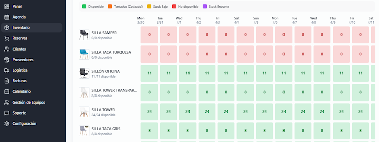 The platform delivers real time inventory availability tracking that enables instant verification of stock levels for specified dates without manual warehouse inspections or record cross referencing. The quotation generation module allows creation of detailed estimates by selecting items, rental periods and quantities with automated price calculation and document generation. A visual calendar interface presents all scheduled events, upcoming deliveries and pending returns in a unified view to support operational oversight across concurrent bookings.