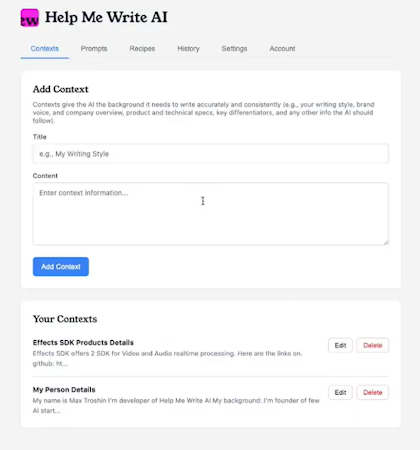 Help Me Write AI is a Chrome browser extension that functions as an AI-powered writing assistant and text editing tool within web environments. The software operates across platforms including email interfaces, document editors, customer relationship management systems, support portals, form fields, and social media inputs. The extension transforms selected text through customizable recipes that execute edits in a single action.
