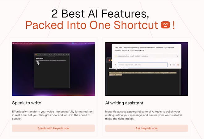 Heynds has key abilities. It transforms your natural speech into perfectly written text in real-time, helping you write up to 3 times faster than typing. It also offers an intelligent AI writing assistant that can reformat any text, polish your writing, refine your message, and generate new ideas directly from your voice or typed words. You can even create your own custom commands for the AI. Heynds works seamlessly across almost any application on your desktop, including Slack, Notion, Gmail, and more.
