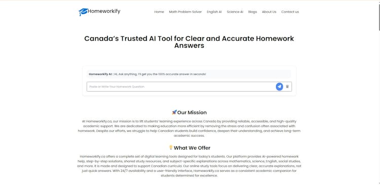 Homeworkify is an AI powered academic support platform that delivers step by step solutions and detailed explanations across multiple academic disciplines. The software functions as a digital learning companion designed to help students master complex concepts through clear curriculum aligned guidance. It serves learners across Canada from elementary through university levels including provinces such as Ontario, Alberta, British Columbia and Quebec. The platform supports educational standards ranging from provincial curricula to postsecondary coursework in various disciplines.