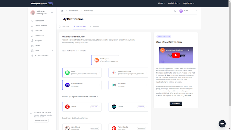 One of the standout benefits of Hubhopper is its extensive distribution network. The platform ensures your podcast reaches a broad audience by distributing it to major directories like Spotify, Apple Podcasts, and Amazon Music. This wide reach helps podcasters grow their listener base without the hassle of manual submissions.