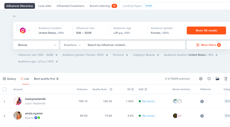 Advanced search filters: Pick the right influencers for your business using a set of filters, like influencer profile, audience demographics, keywords, look-a-like search, etc.