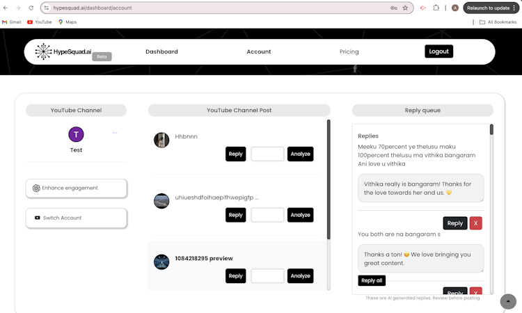 HypeSquad.ai is an artificial intelligence solution that helps YouTube creators manage and engage with their audience. The platform offers personalized comment reply functionality that uses artificial intelligence (AI) to analyze YouTube comments. This allows creators to craft unique and tailored responses that resonate with their audience, fostering a stronger sense of community and loyalty. Its sentiment analysis capabilities also provide creators with insights into their audience's emotions and preferences. Additionally, HypeSquad.ai also helps enhance engagement, boost viewership, and drive sustained channel growth.