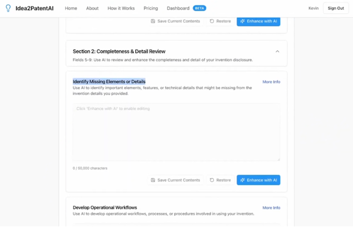 Our platform allows users to write provisional patent applications with an easy-to-use, AI-guided workflow. The platform integrates generative AI to produce a comprehensive patent application—including sections for title, technical field, background, summary, detailed description, claims, and abstract— that is designed to satisfy USPTO filing requirements.