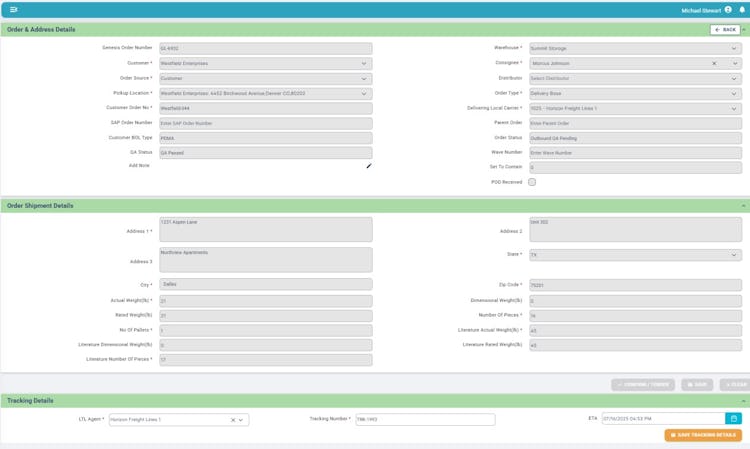 The platform offers modules that cover the entire logistics lifecycle. The order processing module accepts orders in multiple formats from diverse sources and synchronizes them into the system through automated mechanisms. Warehouse inbound operations include palletizing management, quality assurance checks with barcode scanning, and trucking coordination for goods pickup. Outbound operations provide configurable order segregation based on delivery zones, priority settings, and service level agreements. The module also manages re palletizing, quotation preparation, carrier coordination, and documentation for local delivery agents and transport vehicles.