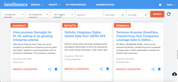 * A leading technology company uses Intellizence to stay informed about events like M&A, Funding in their thousands of B2B customers. The account managers get daily news alerts through email & Slack. The leadership team gets insights (e.g. how many customers got acquired in the last six months?) across all the customers through the Intellizence web application.