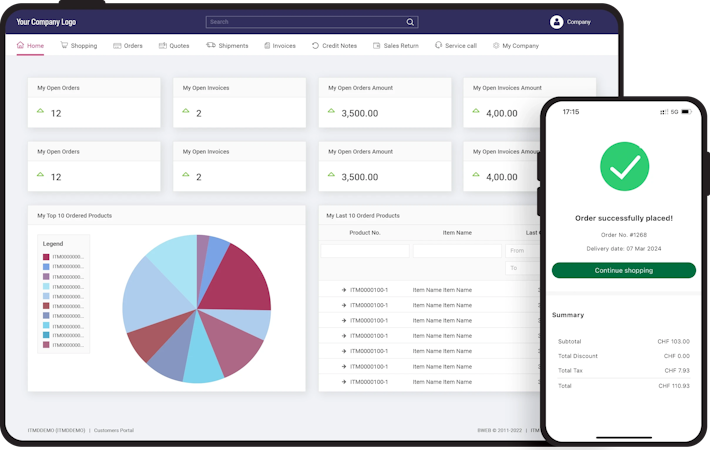 The platform is accessible through web browsers or native mobile applications for iOS and Android, allowing business partners to access information from anywhere at any time. The system supports implementation of specific roles and conditions beyond default SAP B1 settings.